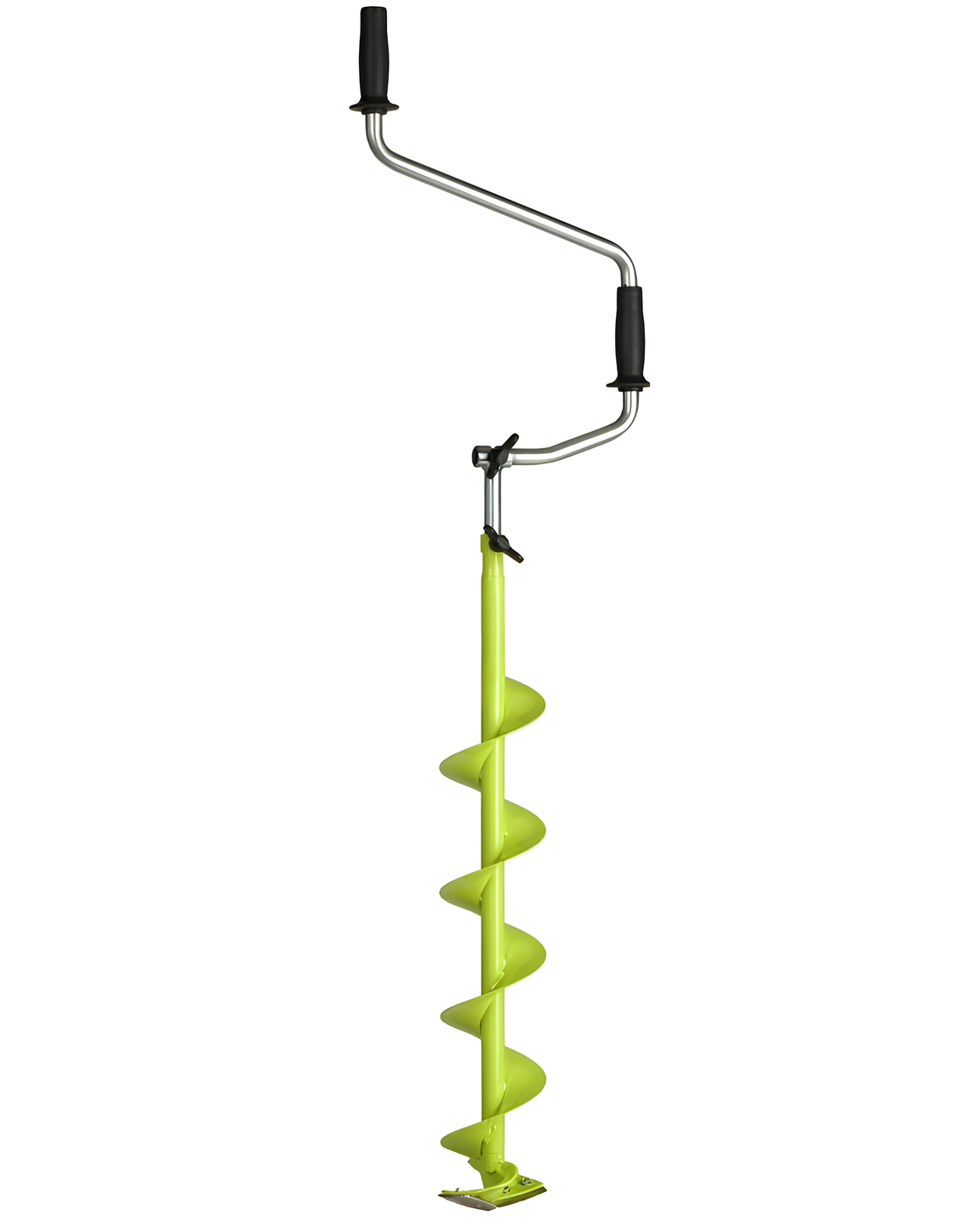 Двуручный бур имеет рукоятки, вынесенные за ось штанги. Неподготовленным рыбакам он может показаться неудобным, так как для бурения требуется определенный навык. Однако нагрузка распределяется на обе руки, что позволяет сделать лунку быстрее и с меньшей затратой сил.